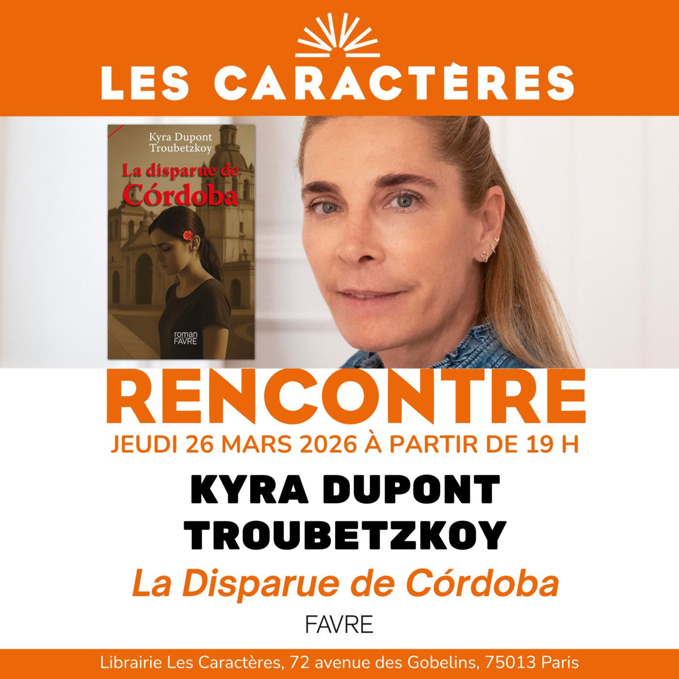 A l’occasion de la parution du nouveau roman de Kyra Dupont Troubetzkoy, La disparue de Córdoba, la librairie Les Caractères (Paris) accueillera une rencontre avec l’autrice. Rendez-vous le jeudi 26 mars à partir de 19h.