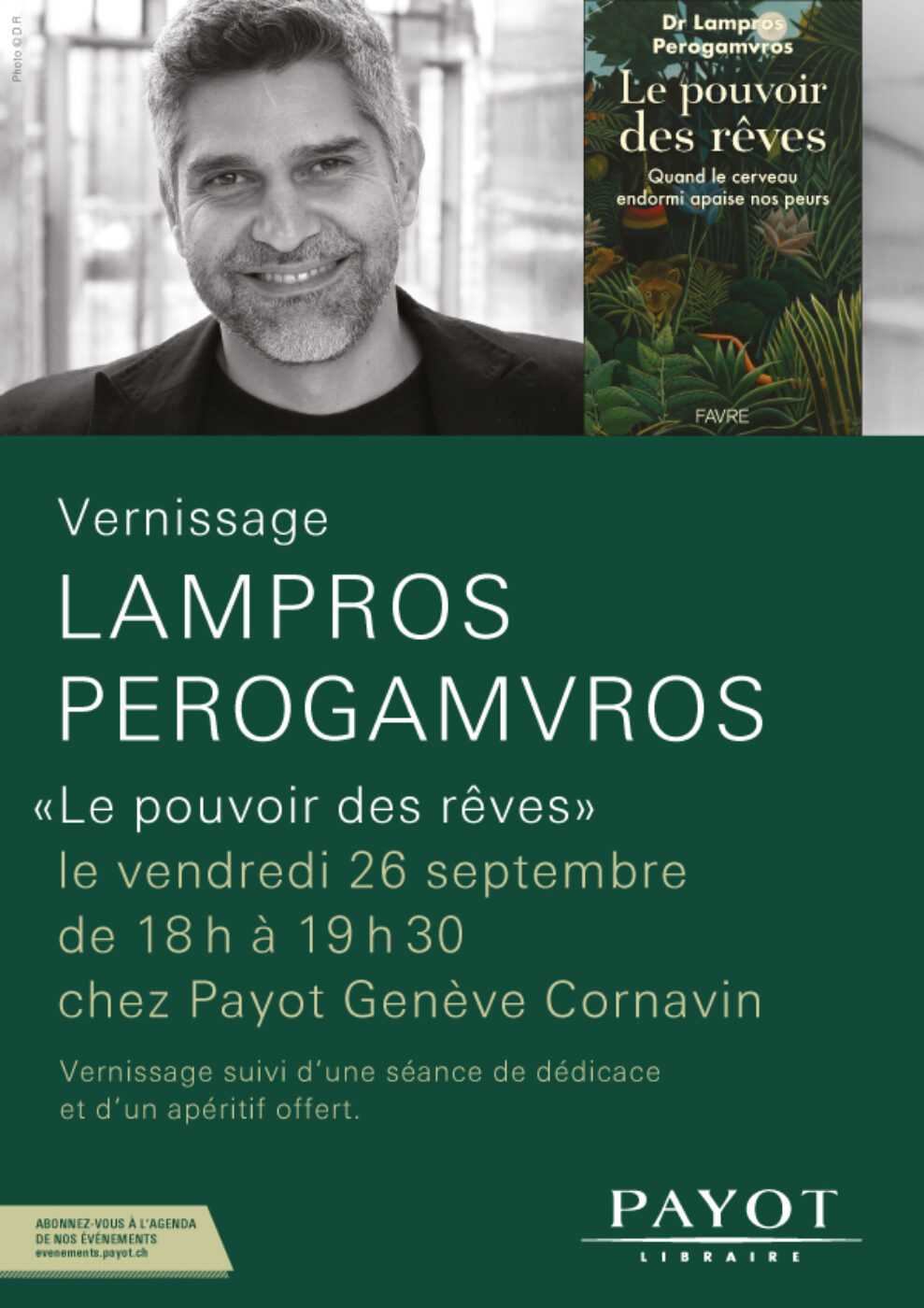 A l’occasion de la parution du livre Le pouvoir des rêves, venez rencontrer l’auteur Lampros Perogamvros lors du vernissage organisé le vendredi 26 septembre de 18h à 19h30 chez Payot Genève Cornavin. Le vernissage sera suivi d’une séance de dédicace et d’un apéritif offert.